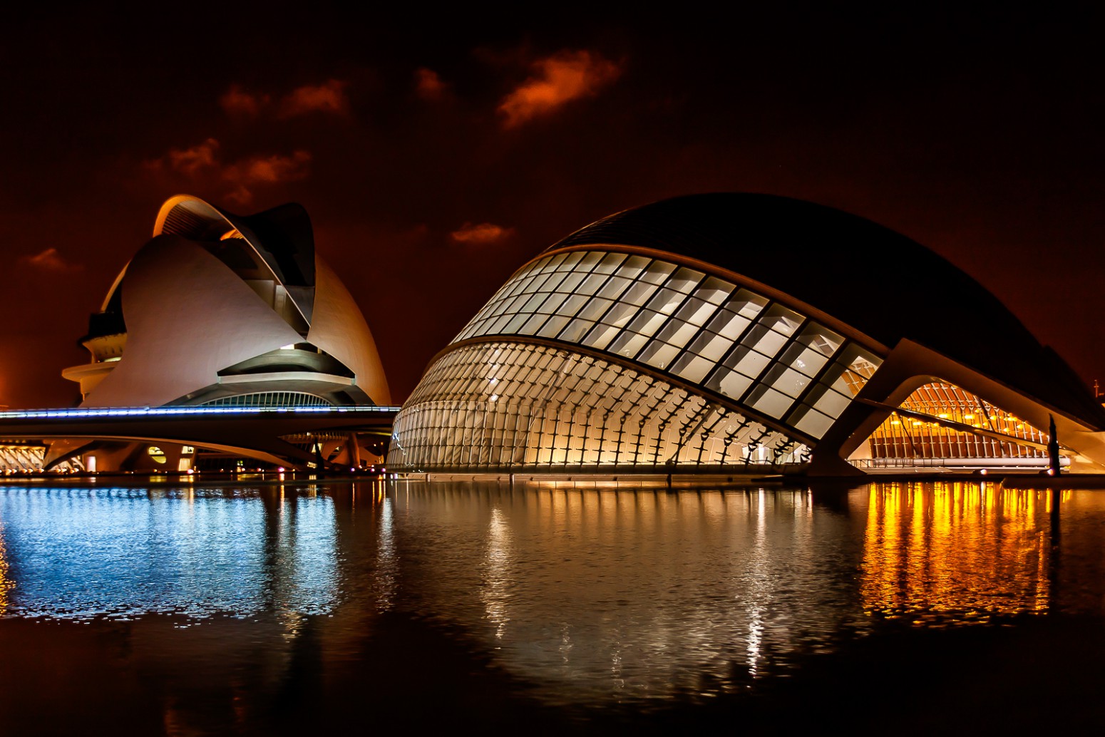 In this photo we can see L’Hemisfèric on right and the Palau de les Arts Reina Sofía on the left.
