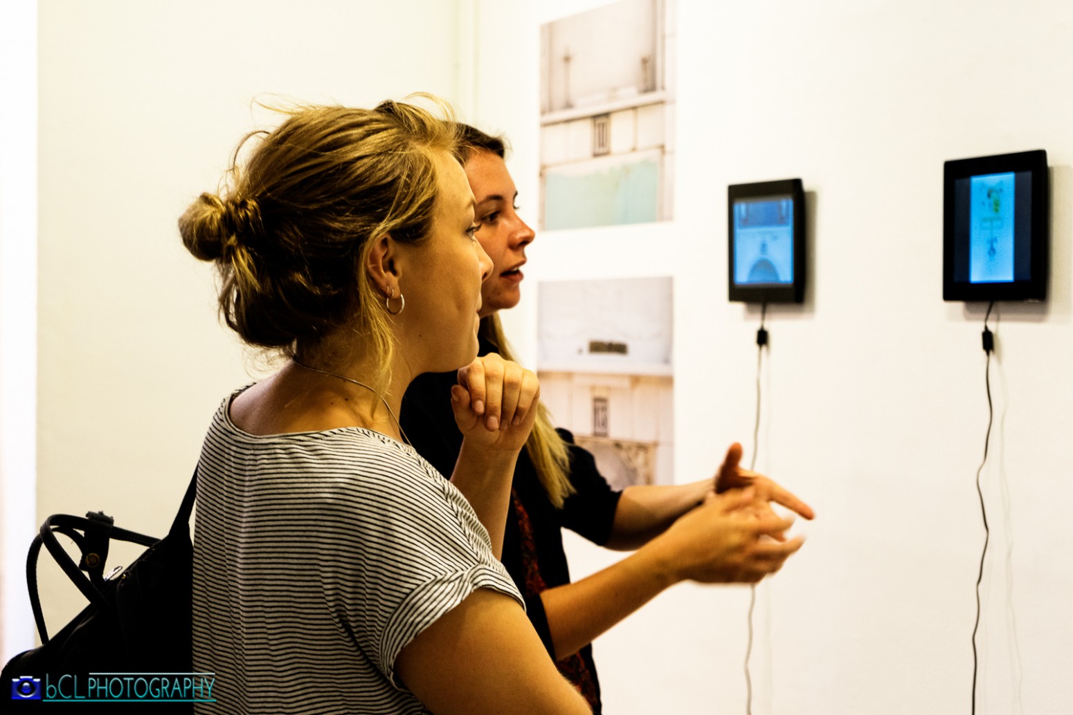 Alongside large-format works, displayed on the walls live digital displays that show all the works presented at the exhibition for each artist.